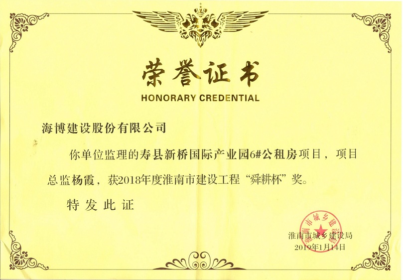 日前,淮南市城鄉建設局公布了2018年度淮南市建設工程優質工程獎名單,我司承擔監理的壽縣國際產業園6#公租房項目喜獲2018年度淮南市建設工程“舜耕杯”獎。 該項目位于壽縣新橋國...