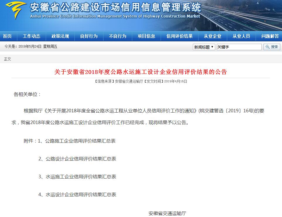 近日,安徽省交通運輸廳公告了“安徽省2018年度公路水運施工設計企業信用評價結果”,我公司被評為省級公路施工行業最高等級“AA”級信用企業。 本次“AA”級信用企業的獲評,是對我司...
